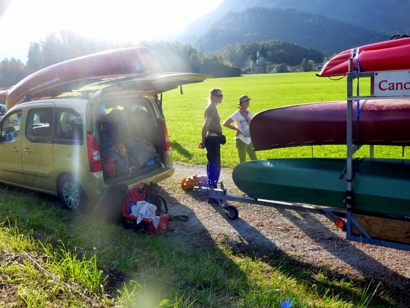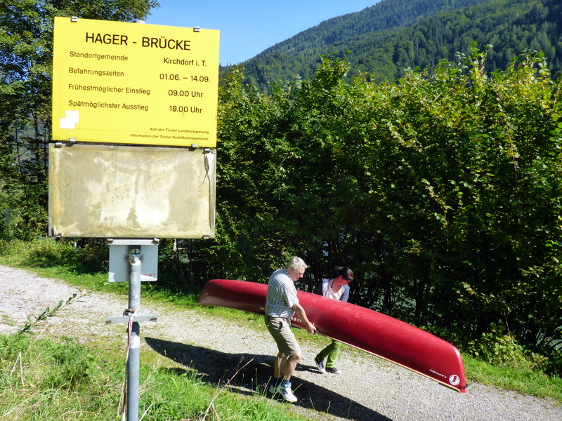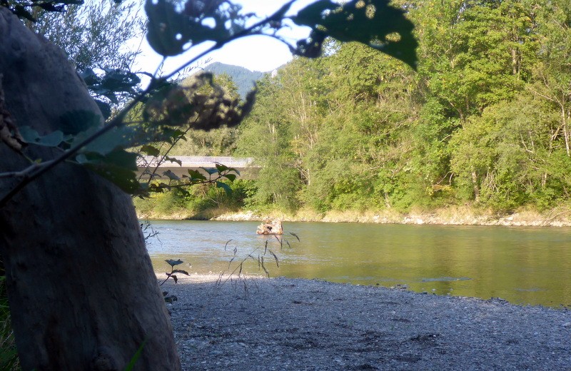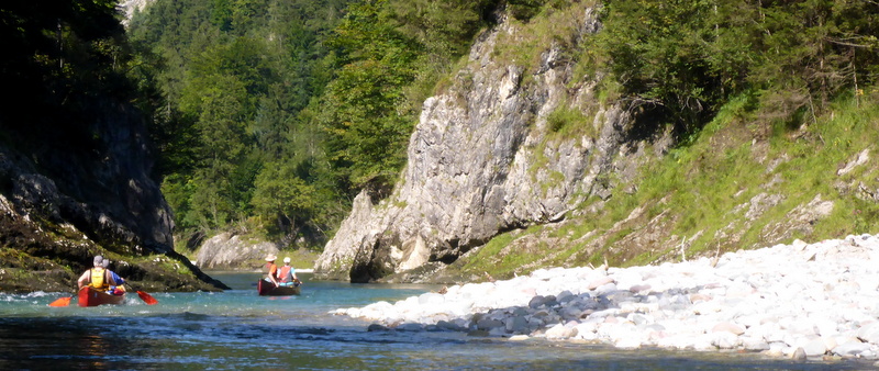 Nach der Schlucht könnte man die Fahrt beenden. Für den Transfer steht ein großer Parkplatz bereit. Wir paddelten noch einige km auf bayrischen Boden weiter. Da bekommt der Fluss die Bezeichnung Tiroler Ache. (Nun dürften alle Unklarheiten bereinigt sein). Hier ist der Fluss um einiges ruhiger, was uns jedoch durch ein wunderschönes, naturbelassenen Flussbett entschädigte. Etliche km weiter mündet der Fluss in den Chiemsee.