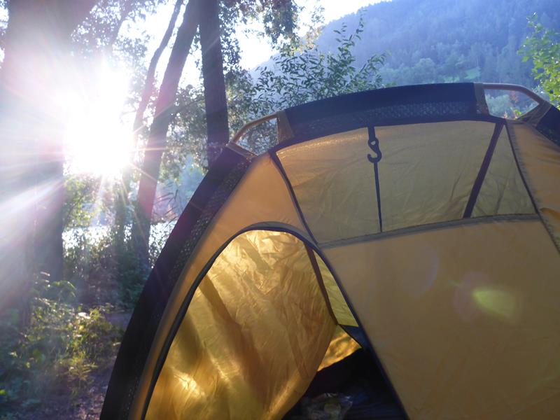 Übernachtet haben wir im Zelt am Flussufer, weich gebettet, auf einer frisch gemähten Wiese, bei sternenklarem Himmel.