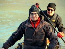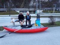 Mit dabei waren Mario & Maria, meine Wenigkeit (Christian) und Andi – ein Freund von mir – der spontan beschlossen hat uns zu begleiten und das erste mal am Wasser war. In Mötz wärmten wir uns auf, indem wir die Schlauchboote voll Luft pumpten und auch Mario und Maria, die schon etwas früher da waren, waren komplett unbeeindruckt von der Kälte. Dies lag sicherlich an ihren brandneuen Trockenanzügen und der grundsätzlich guten Laune die uns alle gepackt hat.