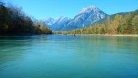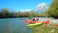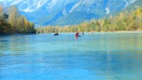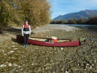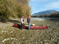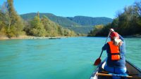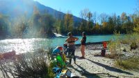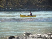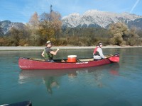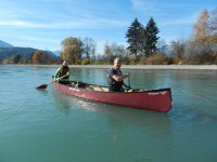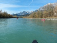 Alles in allem hatten wir auf den gefahrenen 18,7 km fast durchgehend wunderbare Bergkulisse und eine interessante Paddelei mit Abschnitten zum treiben lassen dazwischen. Für Hartschalen-Kanadier schien uns die Tour (zumindest bei diesem Pegel) nur für wirklich sattelfeste und tüchtige Paddler geeignet, da sonst doch die große Chance besteht, mal auf Kies aufzulaufen, einen Stein zu erwischen oder auch über ein Steinwurfwehr drübergeschliffen zu werden. Für unsere beiden Schlauchkajaks und sicherlich auch für bessere Schlauchkanadier sollte das aber alles kein Problem sein.