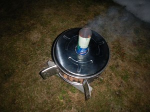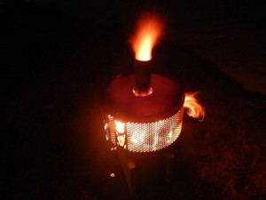 Raucht schon. Hab ursprünglich angenommen, der Kamin muss länger sein, zieht aber ganz gut. Ziemlich gut sogar …. Feuer frei! Der Deckel glüht in nullkommanix. Viel Holz hats nicht gebraucht. Aber auch bei den oberen ovalen Löchern schlagen die Flammen raus. Muss ich noch irgendwie zumachen.