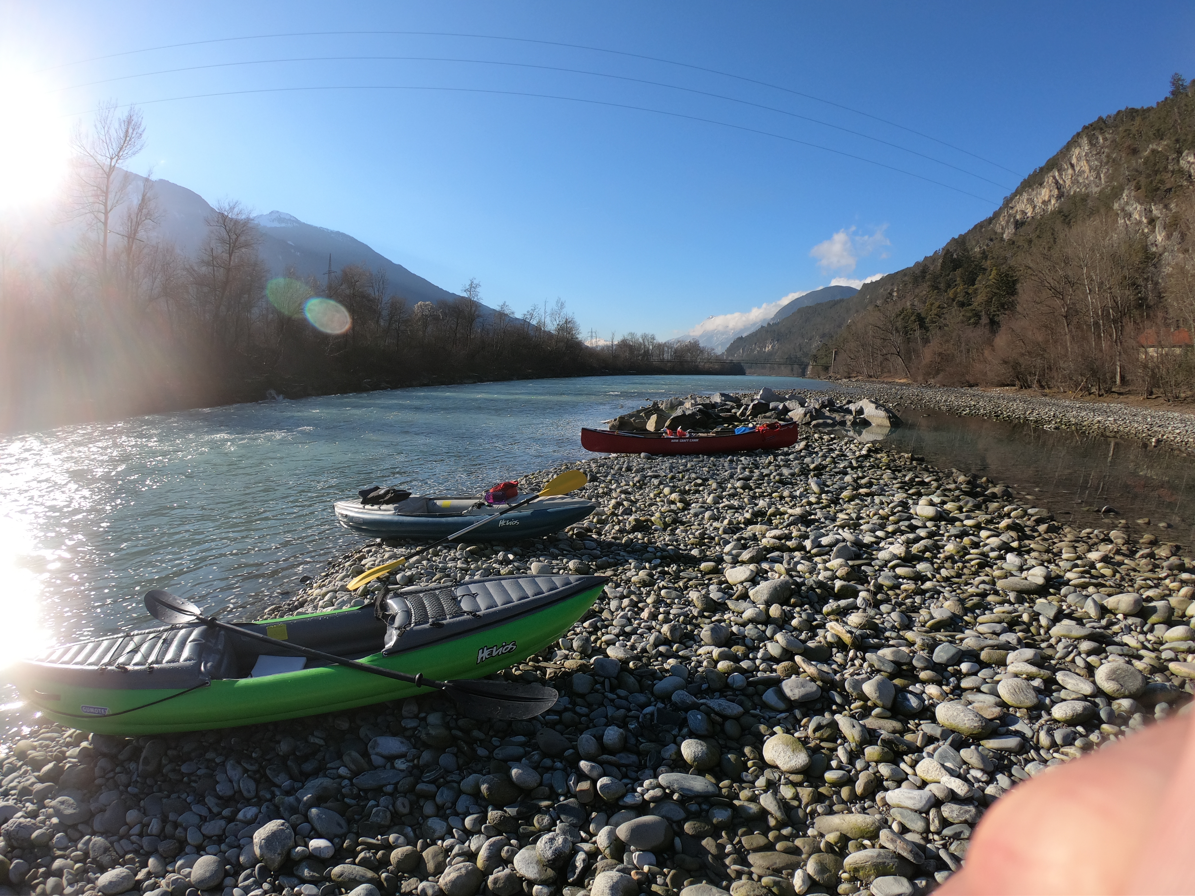 Alles in allem hatten wir auf den gefahrenen 18,7 km fast durchgehend wunderbare Bergkulisse und eine interessante Paddelei mit Abschnitten zum treiben lassen dazwischen. Für Hartschalen-Kanadier schien uns die Tour (zumindest bei diesem Pegel) nur für wirklich sattelfeste und tüchtige Paddler geeignet, da sonst doch die große Chance besteht, mal auf Kies aufzulaufen, einen Stein zu erwischen oder auch über ein Steinwurfwehr drübergeschliffen zu werden. Für unsere beiden Schlauchkajaks und sicherlich auch für bessere Schlauchkanadier sollte das aber alles kein Problem sein.
