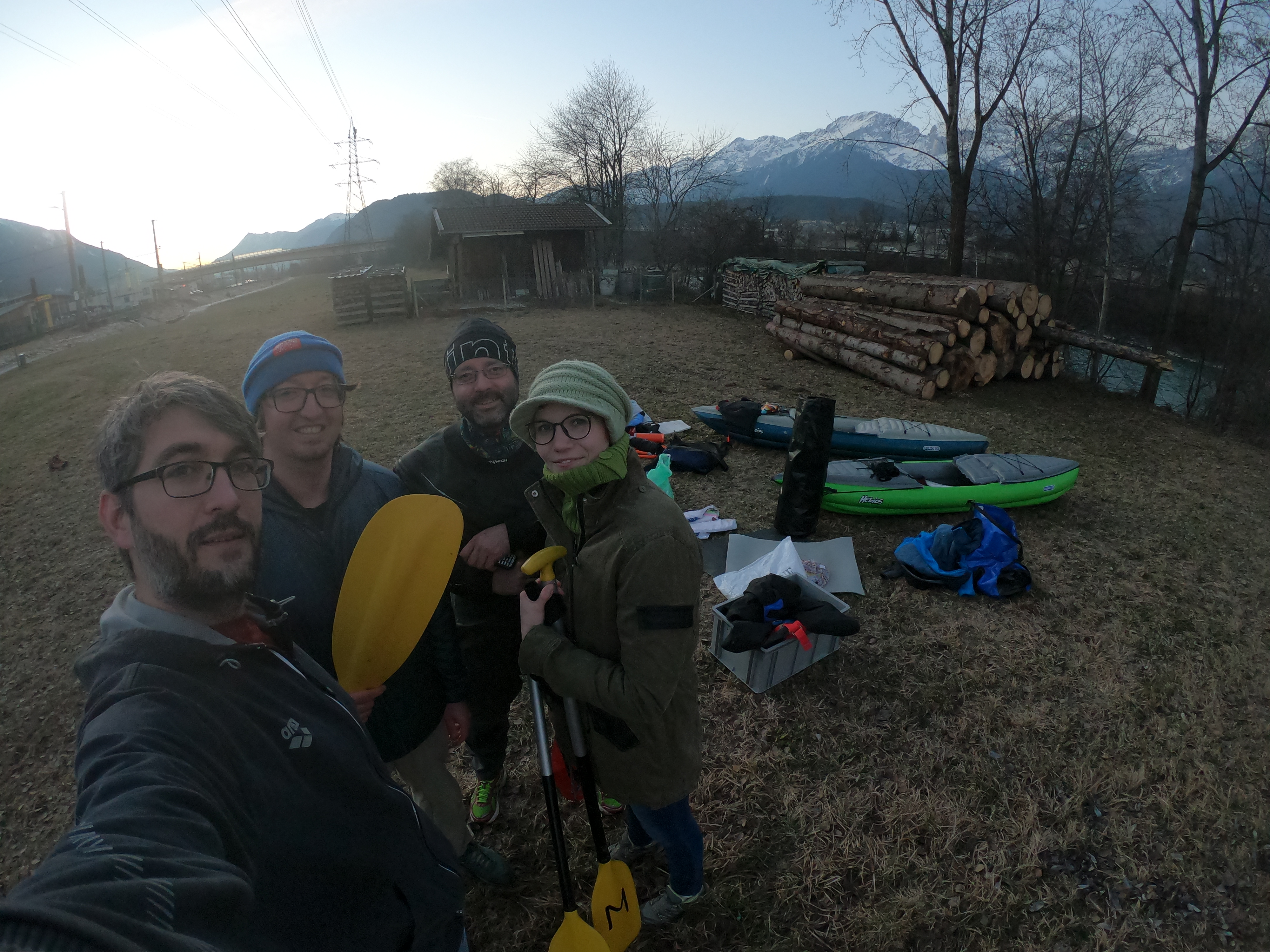 Mit dabei waren Mario & Maria, meine Wenigkeit (Christian) und Andi – ein Freund von mir – der spontan beschlossen hat uns zu begleiten und das erste mal am Wasser war. In Mötz wärmten wir uns auf, indem wir die Schlauchboote voll Luft pumpten und auch Mario und Maria, die schon etwas früher da waren, waren komplett unbeeindruckt von der Kälte. Dies lag sicherlich an ihren brandneuen Trockenanzügen und der grundsätzlich guten Laune die uns alle gepackt hat.